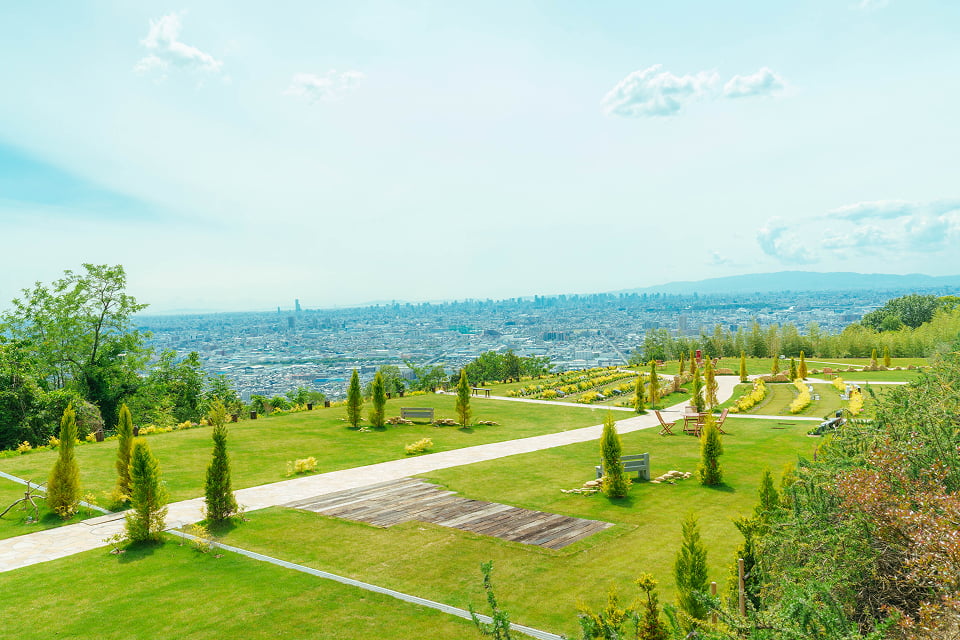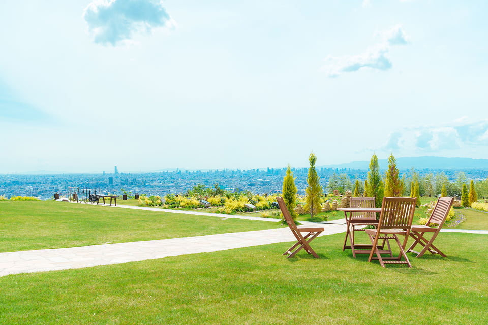 大阪平野を一望する「見晴らしの丘」など芝生を基調とした明るく開放的な区画です。